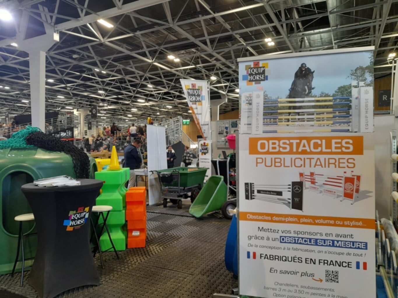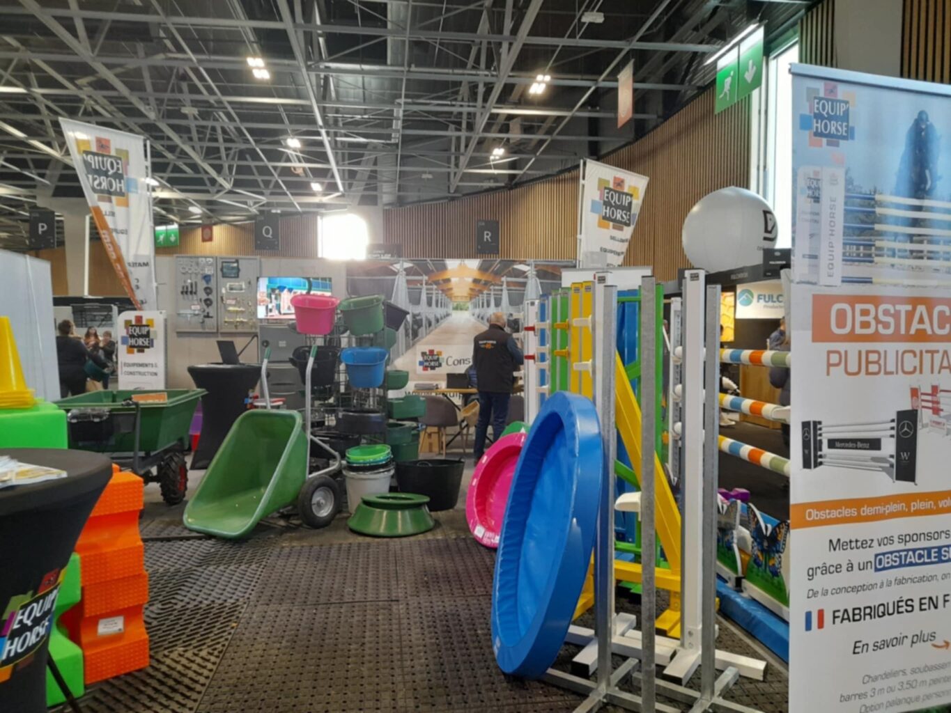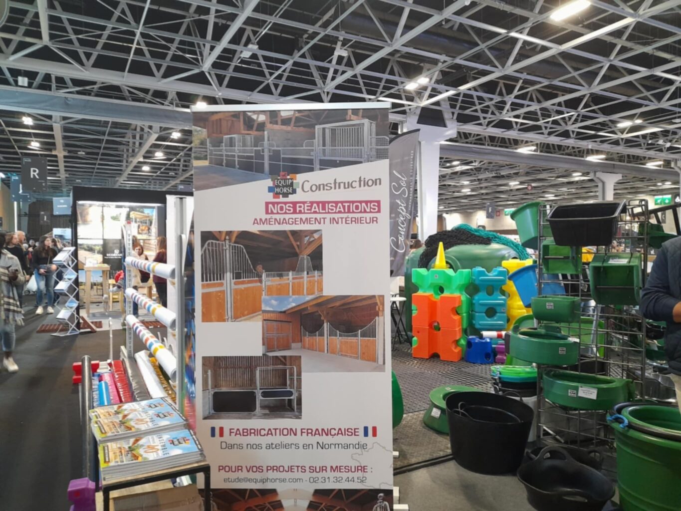 Produits présents sur le stand : râteliers 4 et 5 places, brouettes, cavaletti, barres en mousse, dalles caoutchouc, malles, armoire, mangeoires, bidets...